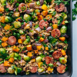 Remove from the oven, add sliced chicken sausage, and toss everything together. Again, spread in an even layer and return to the oven.