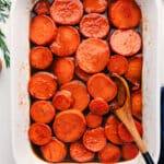 Peel the sweet potatoes and slice into 1/2-inch rounds. Coat a 9×13-inch ceramic baking dish with cooking spray (avoid metal pans; they can add a slight metallic flavor). Add the potato slices, sprinkle with salt, and toss to coat.