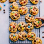 Bake for 8–12 minutes, erring on the side of underbaking to keep them soft and chewy. Remember, the cookies will bake a little more out of the oven, so take them out as soon as the edges start to lightly brown or the tops no longer look wet. Remove from the oven and immediately press any edges that have strayed out a bit inward with the back of a metal spatula. If desired, press a few additional chocolate chips or M&M’s onto the tops of the cookies. If desired, add a tiny sprinkle of sea salt flakes on top of the cookies while the chocolate is still melty. Let cool on the pan for 5 minutes before transferring to a cooling rack. Repeat with the remaining dough until all the cookies are baked or check the storage notes for freezing instructions.
