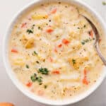Note 1: Whole milk works best for creamy soup. Lower-fat milk (2% or 1%) can be used but won’t be as thick. Avoid plant-based milk for this recipe.Note 2: Use freshly shredded sharp or extra-sharp Cheddar for the best flavor and texture. Pre-shredded cheese may cause the soup to be grainy.Note 3: Dice potatoes into 1/2-inch pieces and chop cauliflower into small bite-size pieces. Smaller pieces cook faster and prevent over-reducing the broth.Storage: Cool soup and store it in an airtight container in the fridge for up to 4 days or freeze in an airtight bag for up to 3 months. Reheat on low, stirring often, and add broth if it’s too thick. Avoid boiling.