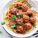 These ultra tender cheese stuffed meatballs are filled with mozzarella, simmered in a homemade marinara, and served over cooked pasta—the ultimate comfort food!