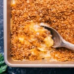 Remove foil and pierce the center of the pan with a table knife to check if the potatoes are tender. If not, bake for 5–10 more minutes and check again. Remove from oven and gently stir the potatoes with a spatula, then smooth into an even layer. Sprinkle with the remaining 1/2 cup Cheddar cheese and the panko topping. Bake for another 10–15 minutes, until golden and bubbly. Remove and let stand for 5–10 minutes before serving. The sauce will thicken as it stands. Enjoy!