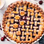 Note 1: You’ll need about 1-½ pounds total. I like using half dark sweet cherries and half Rainier, but you can use all of one type if preferred. If using sour cherries, increase the sugar to ¾–1 cup, depending on how sweet you like it. Frozen cherries work too—halve or quarter them while still frozen, and follow the recipe as written. The bake time may be a bit longer.Note 2: To make a lattice crust, cut the top pie dough into even strips about 1/2-inch wide. Lay half the strips across the pie in one direction, then gently fold back every other strip and weave the remaining strips over and under to create a crisscross pattern. Once the lattice is complete, trim any overhanging dough, then press the edges of the top and bottom crusts together to seal. Crimp the edges by pinching with your fingers or pressing down with a fork for a decorative finish.Storage: Store any leftover cherry pie covered in the fridge for up to 5 days. To freeze, wrap the fully baked and cooled pie tightly and store it in the freezer for up to 3 months. When you're ready to enjoy it again, reheat individual slices in the oven or enjoy them cold straight from the fridge.