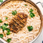 In a very large nonstick skillet (one that can hold all the pasta later), add 1 tbsp butter and olive oil. Heat over medium-high. Once the butter is melted, add the four chicken pieces in an even layer. Cook for 3 minutes, flip, then cook another 2 to 4 minutes or until cooked through. Remove to a plate and rest 5 minutes before thinly slicing or dicing.