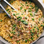 Bring 14 cups of water to a rolling boil in a very large pot. Add 2 teaspoons salt, then cook the spaghetti until al dente according to package directions. Right before it’s done, give it a good stir, then pull out and reserve 1 cup of the pasta water. Do not drain the pasta.