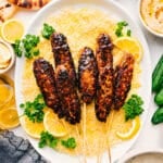 With damp hands (I lightly spritz mine with cooking spray), divide the mixture into 8 equal portions. Shape each portion around a skewer (see note 1), forming koftas about 5 inches long and 1 inch thick. Smooth the surface, then repeat with the remaining mixture. Place the formed skewers on a parchment paper lined pan and chill for 20 minutes, or cover and refrigerate longer until ready to cook.
