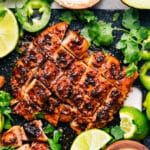 Remove from oven, tent with foil, and let rest for 5–10 minutes. Brush pan juices on top. Drizzle generously with fresh lime juice. Slice or chop as desired.