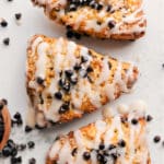 Remove the scones from the oven and let sit on the sheet pan for 5 minutes to finish cooking. Allow them to cool to room temperature, then drizzle the glaze on top using a spoon.