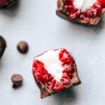 If you would like to fill your raspberries, use a hand mixer to beat softened cream cheese, granulated sugar, and vanilla extract in a medium bowl until completely smooth. Use a spatula to scrape every bit of this mixture into a plastic bag. Using scissors, cut off enough of the tip to pipe the mixture into raspberries. Pipe the cheesecake filling evenly among all the raspberries. Leave chocolate at room temperature to harden completely.