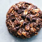 Using a 1-1/2 tablespoons cookie scoop, tightly scoop out and compress the mixture. Place the cookie onto a sheet pan lined with parchment paper. Repeat with all the mixture. Once you’ve got 15 balls formed, gently flatten the balls one at a time in your hands to create a cookie shape. Repeat with the remaining balls. Enjoy immediately!