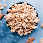 Melt white chocolate chips and vegetable oil in a microwave-safe bowl in bursts of 30 seconds, stirring between each burst for 15 seconds until chocolate is melted and smooth. Transfer melted white chocolate to a plastic bag and seal the bag without air. Cut off the tip of the bag and pipe the melted white chocolate over the cereal (it may seem like too much, but we want the cereal well coated!). As soon as the cereal is covered in white chocolate, sprinkle the cinnamon-sugar mixture evenly over everything.
