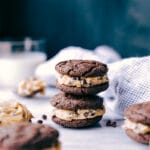Once cookies are mostly cooled (it’s okay if they’re barely warm—they’re so fudgy at this point!), divide frosting evenly among the 17–18 cookies. Frost generously, then sandwich with the remaining 17–18 cookies. You will likely have a bit of frosting leftover—about 1/2 cup. The leftover frosting is delicious enjoyed as a dip—I love dipping fruit, graham crackers, or real Oreos in it!