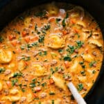 Uncover and stir in tortellini, kale, and heavy cream. Cover and cook on high for 20 minutes, or until tortellini is tender. Taste and adjust seasoning.
