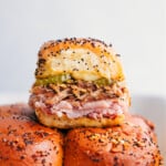 Note 1: If you can find pre-cooked, seasoned, and shredded pork at your grocery store, it makes this recipe super easy! Check near the rotisserie chicken. If unavailable, you can cook and shred pork in a slow cooker or double the ham instead. Don’t use pre-cooked pork in BBQ sauce.Note 2: Sea salt flakes are large, so you can’t substitute them directly with fine salt. If using fine/table salt, add just a small pinch instead.Storage: These Cuban Sliders are best fresh, but you can store leftoveres in airtight containers in the fridge. They will get softer and a bit soggy over time.