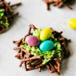 Before the chocolate hardens, add the coconut and green food coloring to a bowl. Mix until the coconut is completely dyed. Scoop an even amount of the green coconut on each nest.