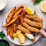 Optionally top fries with Parmesan right out of the oven. Serve immediately with tartar sauce and lemon.
