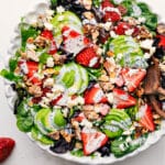 Strawberry Poppyseed Salad is a fresh mix of sweet strawberries, creamy avocado, candied almonds, and tangy feta—all tossed in a dreamy poppyseed dressing! Shop the recipe here.