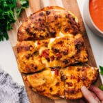 Transfer to a cutting board, cool for 2 minutes, then cut crosswise into 6 sandwiches. If desired, gently lift the tops and spread with pesto. Serve warm and gooey!