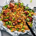 Evenly divide drained ramen, smoked sausage, corn, edamame, and white parts of green onions among the 3 foil pieces. Fold up the packets, leaving an opening at the top.