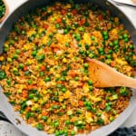 Add the oil to the skillet and increase heat to high. Add diced onion and stir for about 3–4 minutes or until beginning to turn translucent. Add garlic and ginger and stir for about 20 seconds. Add frozen peas, carrots, and corn (no need to thaw). Stir around and cook for about 2–3 minutes or until veggies are defrosted and the excess water has evaporated completely. Add cooked and cold rice and the prepared sauce. Cook for 1 and 1/2 to 2 minutes or until the sauce coats all the ingredients.