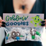 If desired, make pretzel monsters by melting chocolate and attaching candy eyeballs to the pretzels with the melted chocolate. Let dry completely, then add a few pretzel monsters to individual bags.