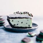 Coarsely chop 3–5 leftover mint Oreos and sprinkle over the pie. Cut the pie into slices. If the pie is especially firm, let it stand for 5 minutes at room temperature before cutting and serving. Use a hot, sharp knife (run it under hot water, dry with a towel) to make cuts into the pie. This will take some muscle! Enjoy promptly and return any leftovers to the freezer.