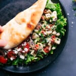 Pita: “Grill” the pita bread on the stovetop over an open flame (on medium heat) until slightly charred, about 10–15 seconds per side (flipping with tongs). Immediately fold in half and cover with a clean towel until ready to serve. Alternatively, warm (covered with a damp paper towel) in the microwave.