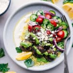 Couscous: Meanwhile, pour 1 cup water into a small pot. Add 1 teaspoon olive oil and bring to a boil. Once boiling, remove the pot from heat. Stir in the uncooked couscous and cover the pot with a lid. After about 2–4 minutes the liquid should be absorbed; fluff couscous with a fork. Stir in 1/4 cup of the lemon-herb sauce, 1 tablespoon lemon juice, and about 1/4 teaspoon each of salt and pepper (again to personal preference).