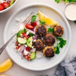 My fave way to serve: Spread a big spoonful of Greek yogurt on the plate; sprinkle lightly with salt. Add a layer of rice or couscous, then top with meatballs. Accompany with lemon wedges, charred/warmed pita, and Greek salad on the side. Finish by drizzling the feta sauce over the meatballs and enjoy!