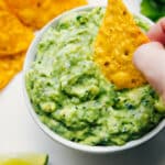Give the guacamole a taste test (with chips) to properly gauge saltiness (chips are salty!) then adjust any flavors to personal preference—more salt/pepper/lime/lemon, etc. Serve with chips or however you’d like to enjoy it.
