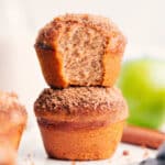 Note 1: Apple pie spice combines cinnamon, nutmeg, cardamom, allspice, and cloves to create a blend that can be used in so many recipes! I have a homemade apple pie spice recipe, or you can buy it in the grocery store. For a more spiced/flavorful muffin, add up to 1 teaspoon to the batter.Note 2: If you aren’t used to lower-sugar treats, use sweetened applesauce. If you want these muffins to be more nutritious and less sweet, use unsweetened. Cinnamon-flavored applesauce is also nice for a more spiced muffin.Note 3: Whatever yogurt you use, make sure you like it plain, or it won’t add a lot in way of flavor to these muffins. I recommend a vanilla-flavored Greek yogurt instead of plain. I also recommend full-fat yogurt, so these muffins don’t end up overly watery. For a stronger apple flavor, try a full-fat apple-flavored Greek yogurt.Storage: Once completely cooled, store the muffins in an airtight container at room temperature for 2–3 days. Cool muffins completely before wrapping and freezing: wrap muffins individually in plastic wrap and place in large freezer bags. To thaw, set out at room temperature, or heat frozen muffins in the microwave.