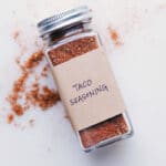 Note 1: Chili powder is not to be confused with chilli powder, which is very hot. I use American chili powder in this homemade taco seasoning.Note 2: If you’re using ground turkey or ground beef, add beef bouillon powder. If using ground chicken, add chicken bouillon powder. If using bouillon powders, use tomato sauce instead of stock/broth or it will be too salty. If you are making vegetarian or vegan tacos, use vegetable bouillon and a vegetarian alternative.Nutrition Note: Nutrition information is for the spice blend only.Storage: Store in an airtight container in a cool, dark place (like a cabinet or pantry). I like to store this homemade blend in small plastic bags or make a big batch to store in a jar or spice containers (I love these!) As long as it is stored properly, homemade taco seasoning can last 6 months up to a year.Make Ahead: When I make this recipe, I typically make 5 or 6 more “packets” of the seasoning. Since all the spices are out and I’m measuring anyways, it takes just a few extra minutes. Measure out the spices, put them in labeled individual snack-size bags, and store those packets with your spices.