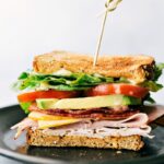 Set out 4 plates. Set 2 pieces of toasted bread on each plate and spread the sauce on both sides. Layer the ingredients however you’d like, using the cooked bacon (3 per sandwich), lettuce, cheese, sliced tomatoes, sliced avocado, 2–3 pieces of turkey, and 2–3 pieces of ham, depending on their sliced thickness and desired quantity.