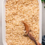Note 1: Long-grain brown rice works best for texture, but medium or short-grain is fine too. Avoid rice that looks discolored or smells musty for best results.Note 2: Olive oil adds flavor and keeps rice from sticking, so don’t skip. You can use other oils or butter if preferred.Note 3: Boil extra water to account for evaporation. Measure exactly 4-2/3 cups after boiling to ensure proper cooking.Rest Time: Let the rice rest after baking to absorb moisture and avoid mushiness. Skipping this step can lead to soggy rice.Storage: Cool rice completely before storing it. Transfer it to an airtight container or sealed bag and refrigerate for up to 4 days or freeze it for up to 6 months.