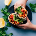 Lay out the tortillas. Spread 1/4 cup (60g) hummus on each tortilla—smooth all over the tortilla. Top with 1/4 of the air fried chickpeas (about 1/3 cup per tortilla); press the chickpeas gently into the hummus to ensure they stick. Top with veggies divided evenly among each wrap: cucumber sticks, bell pepper slices, carrot slices, avocado slices, a large handful of mixed greens, and if desired, a few sprigs of fresh parsley. Drizzle everything with lemon juice or Sriracha (or both; I love lots of Sriracha!) and another pinch of salt and pepper. Roll up tightly and enjoy immediately!