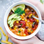 Serve bowls of soup with your favorite toppings. I love freshly shredded cheese, a large spoonful of sour cream, additional cilantro, chopped avocado or guac, fresh lime, and lots of tortilla strips!