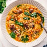 Reduce heat to low and add spinach and cooked meatballs. Simmer until the spinach is wilted and the meatballs are warmed through. Add more broth if you prefer a thinner soup. Taste and adjust seasoning as needed.