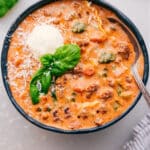 This Lasagna Soup Recipe is the ultimate cozy meal, bringing all the comfort of classic lasagna into one pot. It’s loaded with a rich tomato broth, hearty sausage, tender lasagna noodles, and a medley of veggies. And of course, it’s finished off with plenty of melty cheese on top!