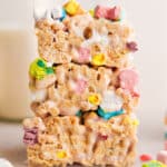 Once melted, remove the pot from the heat and stir in the vanilla extract and salt. Add in Lucky Charms cereal and stir gently to incorporate. Add in the remaining marshmallows and stir until ingredients are well and evenly coated in marshmallow mixture. (It’s not intended for these additional marshmallows to completely melt.)