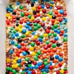 Pour the entire can of sweetened condensed milk over the graham cracker crust. Spread it into an even layer with the back of a spoon. Evenly top the condensed milk with quick oats, chocolate chips, white chocolate chips, caramel bits, and the M&M’s. Gently press everything into an even layer.