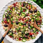 Note 1: If you're sensitive to raw onion, soak the diced onion in salted ice water for 10 minutes. Drain well before adding.Storage: Once dressed, the salad doesn’t store well—the veggies soften and the orzo bloats. For make-ahead, keep everything separate and toss with dressing before eating. For meal prep, store the salad without dressing and keep onions, olives, and feta separate. Let leftover dressing sit at room temp for 20 minutes, then shake well.