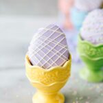Using an egg cookie cutter, cut out 12 egg cakes. (Use the leftover pound cake and eat it with strawberries + whipped cream!) Place the mini egg cakes on the prepared sheet pan and then in the freezer while you prepare the frosting.