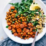 To serve: Add couscous to a large bowl. Top with roasted carrots and chickpeas. Toss with dressing (see note 1), almonds, and currants. Add fresh herbs and/or arugula to desired preference and enjoy!