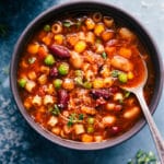 This Olive Garden Minestrone Soup Recipe is a hearty, veggie-packed soup loaded with ditalini pasta, a rich tomato broth, and plenty of nutritious veggies. Top with Parmesan, grab some crusty bread (or a bread bowl), and dig in!