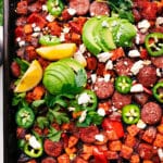 Add prepared sweet potatoes, peppers, and onion to the sheet pan. Drizzle with 2 tablespoons olive oil and sprinkle with about 3/4 of the seasoning mix (just eyeball it). Toss to coat evenly, then spread out so they don’t overlap. Roast for 20 minutes.