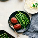 Place in the oven for 20–25 minutes. Remove from oven, dab up some of the grease (shouldn’t be too much with lean ground beef) with a napkin, and add trimmed green beans in the last section of the sheet pan. Drizzle with olive oil and about 1/2 teaspoon salt and 1/4 teaspoon pepper. Toss and place in the oven for another 15–20 minutes or until the beans are roasted and the meatloaf is cooked to an internal temperature of 160°F.