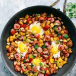 If you want to include eggs, make four wells in the hash and crack the eggs into them before the veggies are finished cooking to prevent them from browning too much. Fry until the whites are set and the eggs are cooked to your liking, then remove and serve immediately.