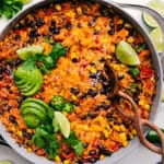 Note 1: Use a large skillet for this recipe since everything cooks in one pan. A 12-inch skillet works best. A nonstick pan helps prevent the rice from sticking and burning.Note 2: Add your favorite toppings: 1/4 cup finely chopped cilantro, chopped avocado or guacamole, 1 small Roma tomato or a handful of cherry tomatoes (chopped), cilantro-lime sauce, and sour cream.Storage: Store leftovers (without any toppings) in an airtight container in the fridge for up to 4 days. Reheat in a skillet or microwave until warmed through.