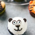 Press 2 dark chocolate chips to make the panda some ears. Add 2 more chocolate chips for eye sockets and 1 below for a nose (the nose chocolate chip is pressed into the cupcake on its side).