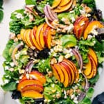 This salad is best served immediately after it’s dressed, so wait to add dressing until you’re ready to serve (see storage). Add mixed greens to a large bowl. Drizzle with a few tablespoons of the dressing and toss to coat. Add red onion, peaches, avocados, candied almonds, and cheese.